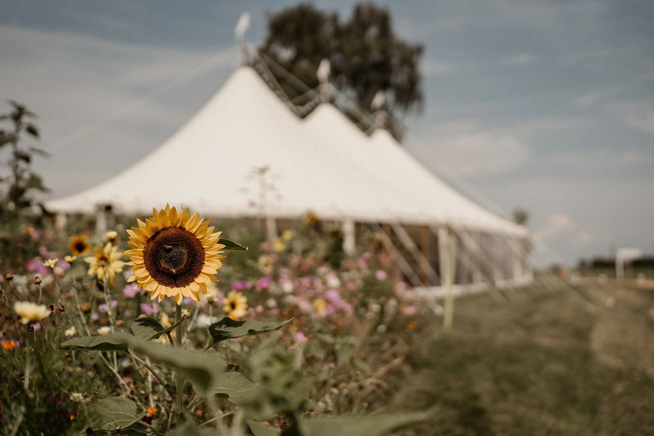 Blumen soweit das Auge reicht, mit dem Marquee im Hintergrund.